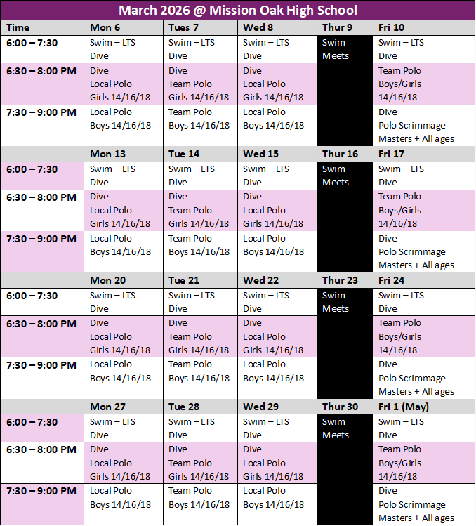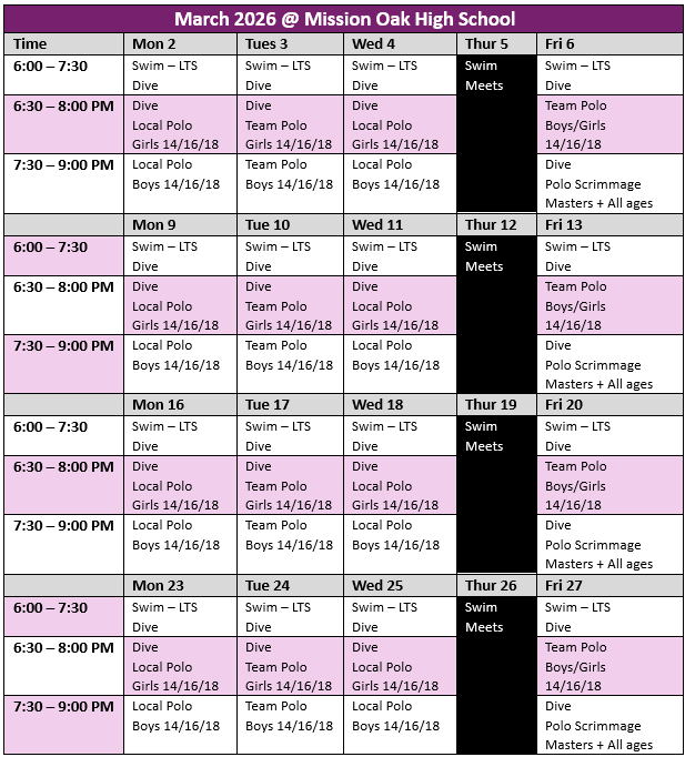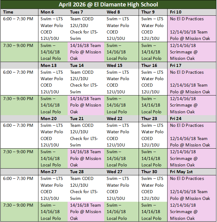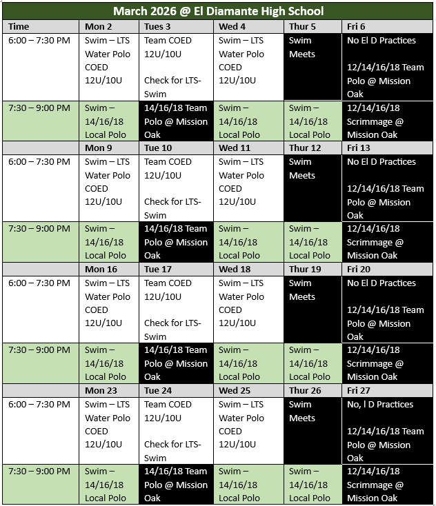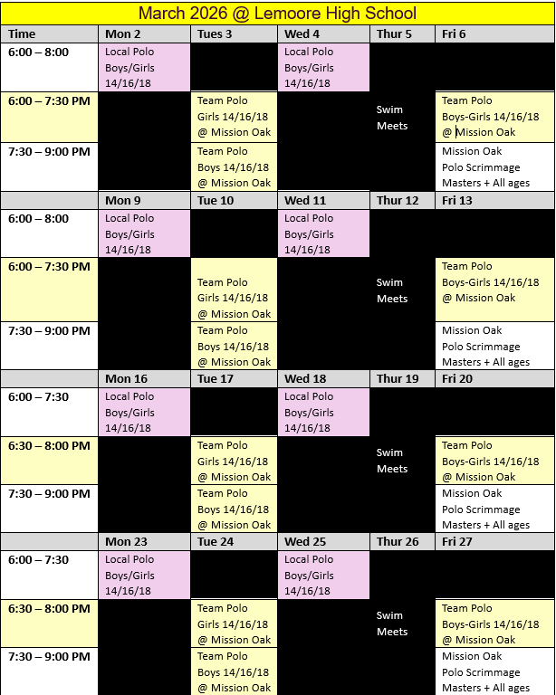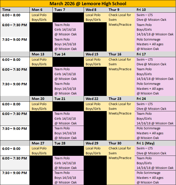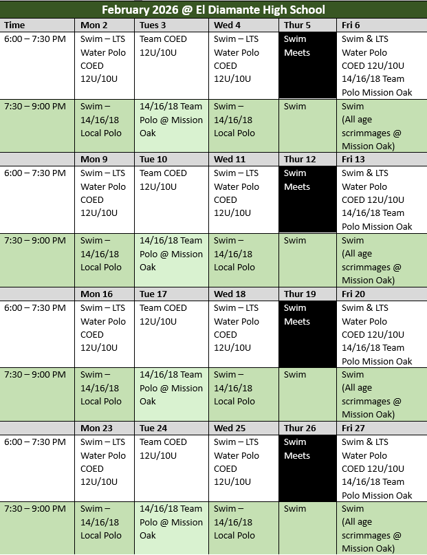 2026 SPRING SESSIONFebruary 2026 through April 2026Remember, a single membership allows you to attend water polo or swim practice at either pool. Learn to Swim classes are held in 30-minutes sessions during the practice hours listed at the El Diamante and Mission Oak location. If you sign up for learn to swim, just come to the pool of your choice to discuss you desired 30-minute lesson schedule with the instructor. Currently, Lemoore offers water polo only.SOVA VISALIASOVA TULARESOVA LEMOORE
